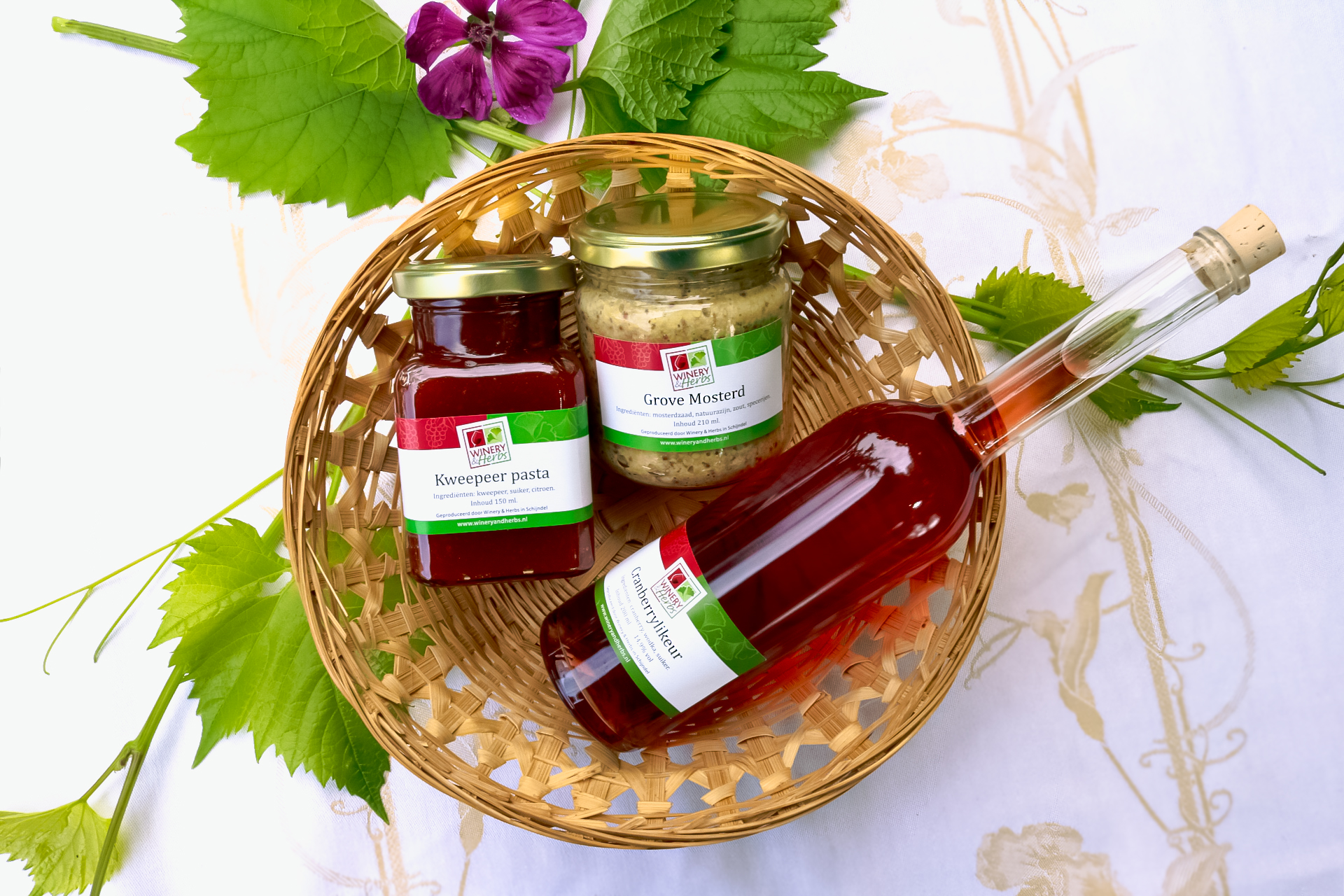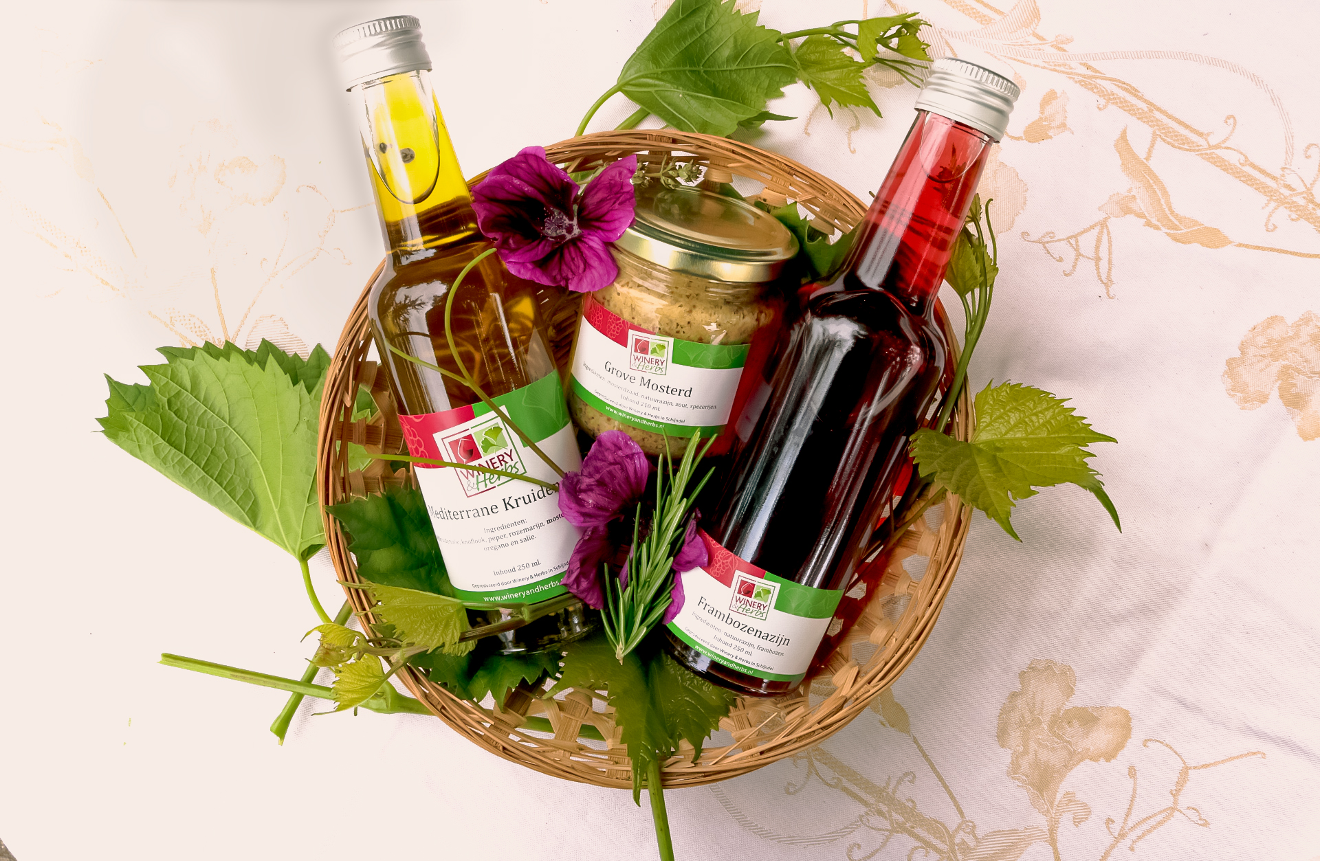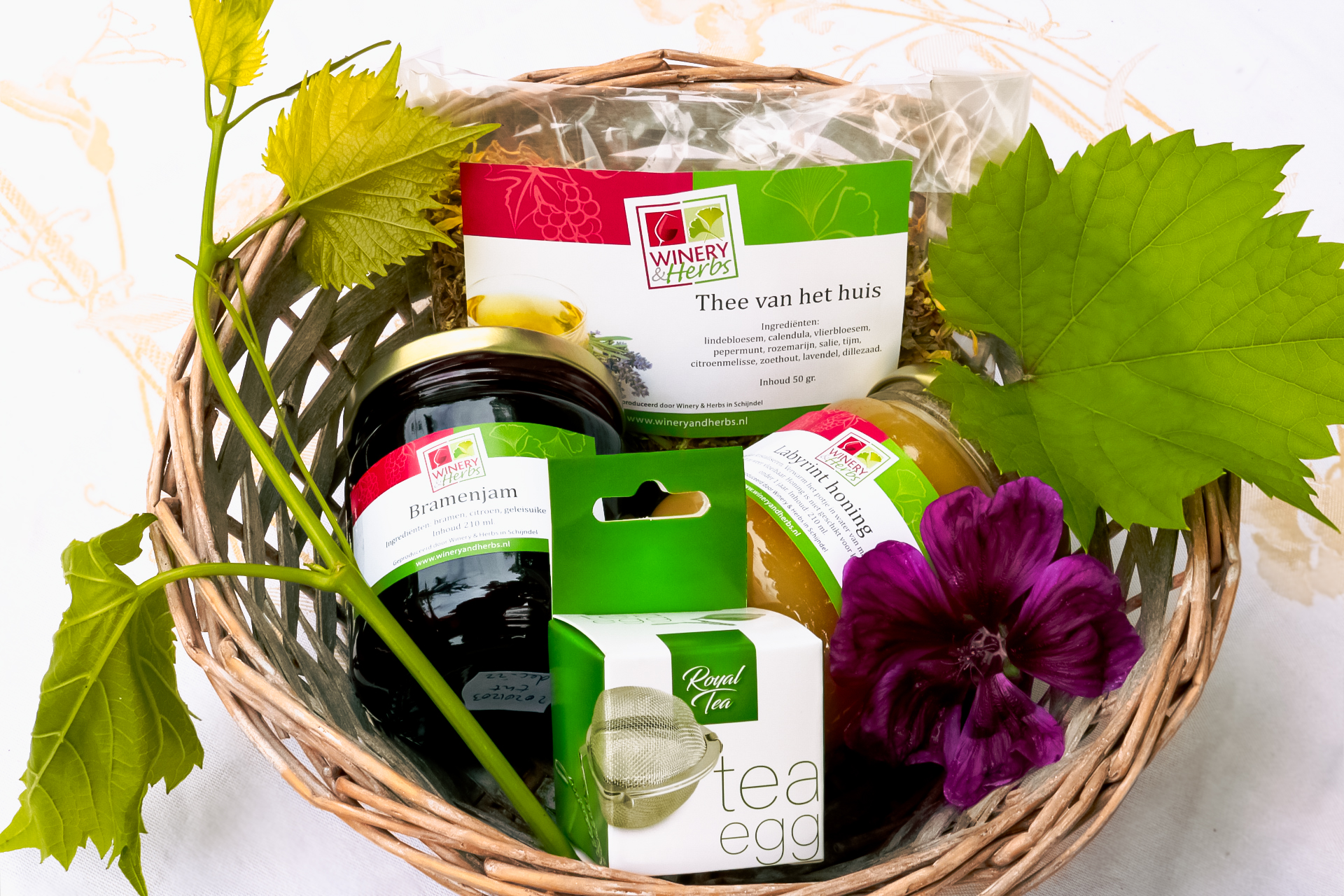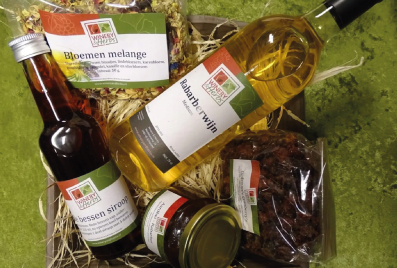 Bij Winery & Herbs maken we zo`n 80 producten zelf, die we ook in onze winkel verkopen. De grondstoffen produceren we allemaal zelf. Ook verkopen we steeds meer producten van collega`s uit de buurt. Heb je een streekpakket nodig als cadeau of als geschenk bij symposia, lezingen of seminars? Wil je eens kijken om kerstpakketten zelf samen te stellen? Kom gerust eens kijken in onze winkel. Hieronder vindt u voorbeelden van mogelijke pakketten.